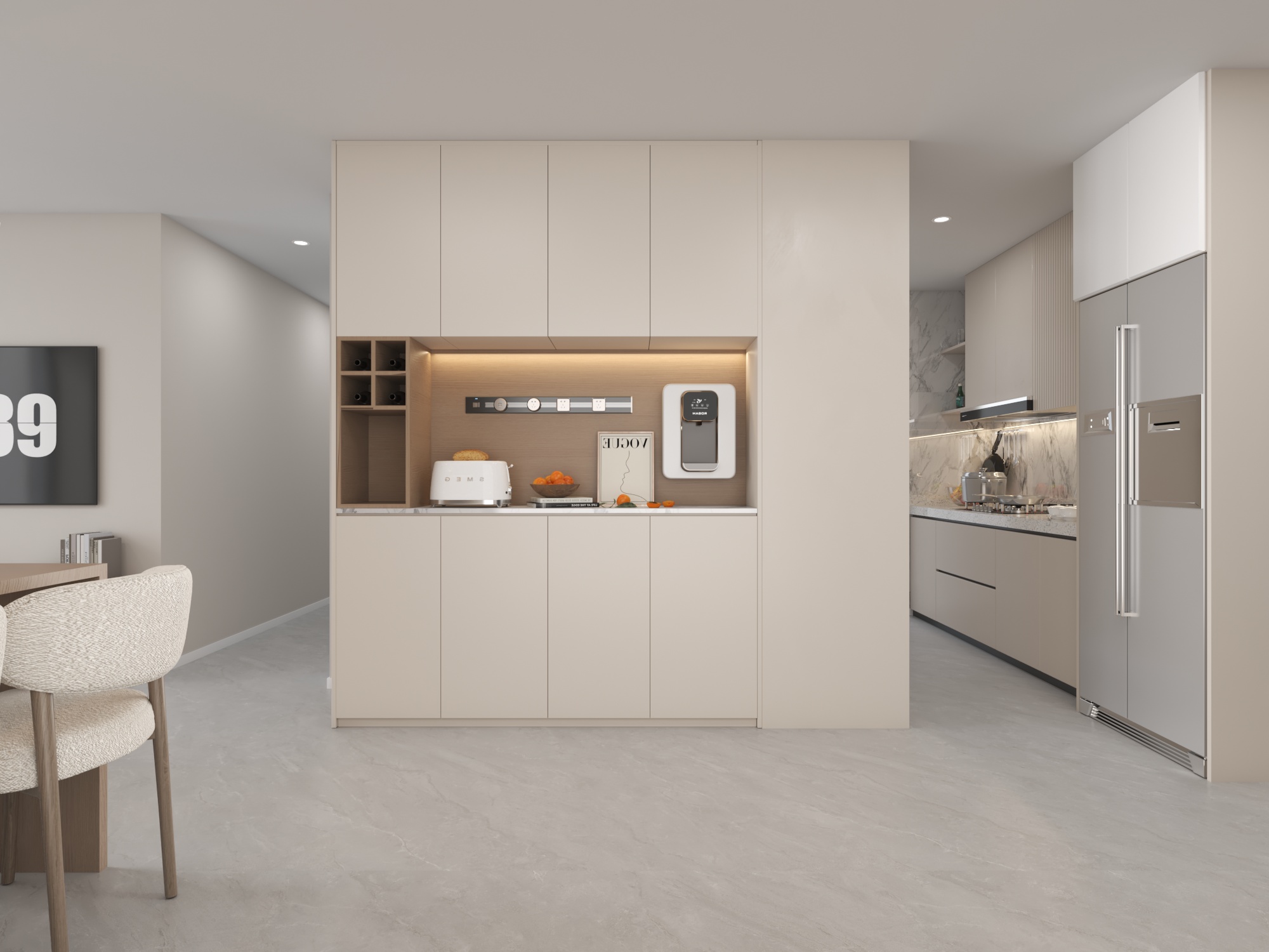 這個設計以現代極簡與日式無印風格為核心,透過溫潤木質材質與米白色系,營造出自然純淨的生活氛圍。簡潔俐落的線條搭配精緻的燈光設計,使整體空間散發溫暖且富有層次感的美感。開放式設計結合功能性規劃,不僅強調實用與美學的平衡,更展現出對細節的極致追求。這樣的空間流露出簡約而溫馨的生活態度,是現代人追求舒適與品質生活的完美詮釋。