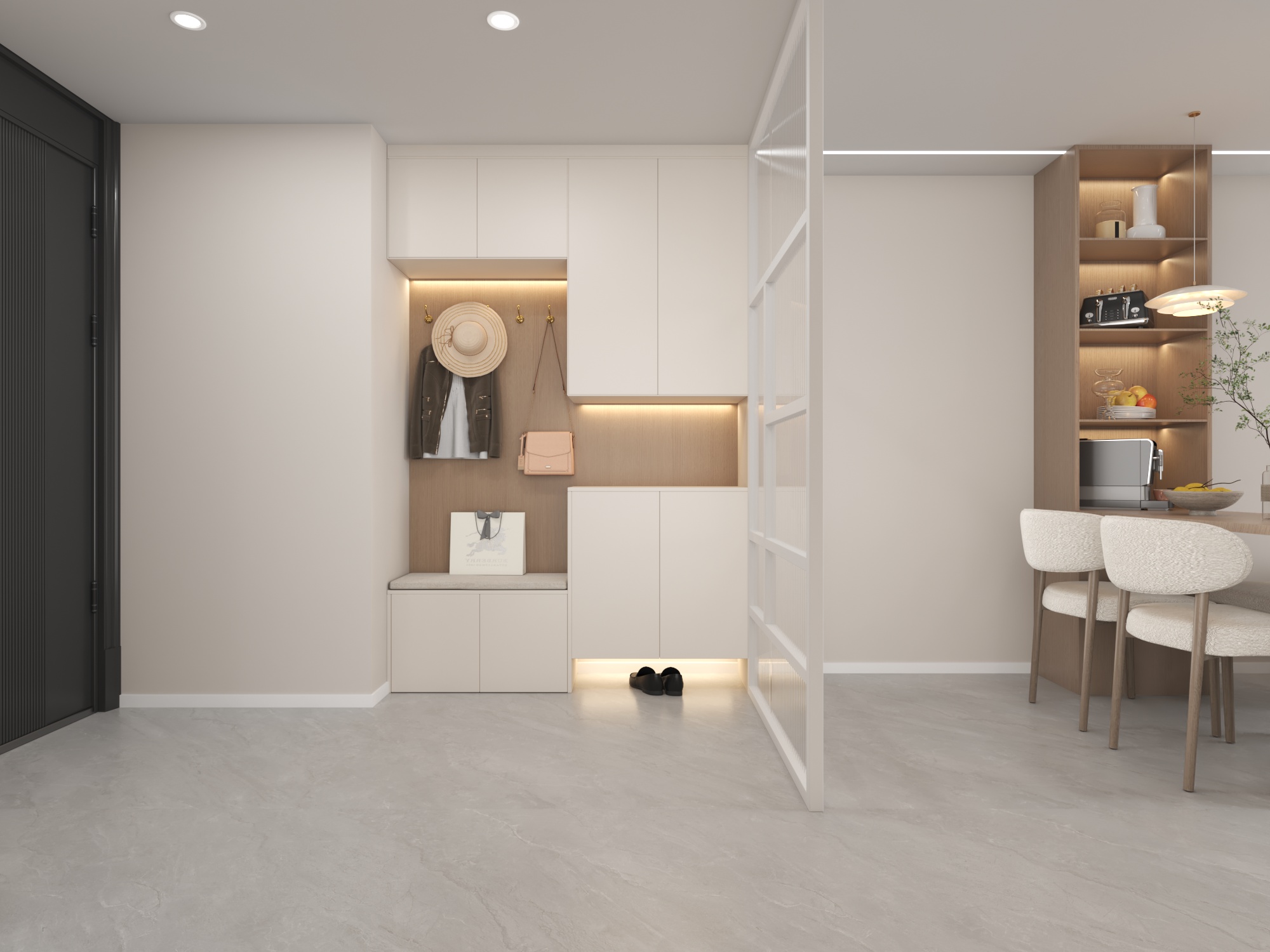 玄關設計以實用與美感兼備為理念,透過溫潤木質與純淨白色櫃體的搭配,營造出簡約而有層次的迎賓空間。開放式掛鉤與展示層架的結合,讓外出物品的收納更加有條不紊,而內嵌燈光的設計,為玄關增添了柔和的氛圍感。坐墊區的設置貼心實用,方便日常更換鞋履,同時也體現了空間的細緻考量。