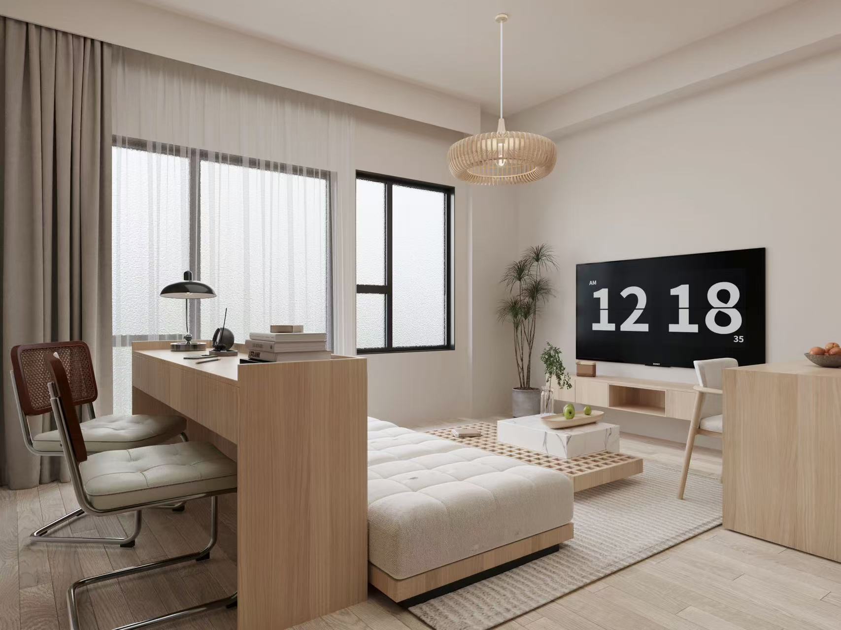 以「現代簡約」結合「日式無印風」為核心,營造出平靜且溫暖的生活空間。沙發背牆延伸的開放式工作桌,不僅提升空間利用率,還兼顧了實用性與美感。電視牆採用極簡設計,搭配木質櫃體,充分展現整潔有序的室內裝潢理念。暖色木地板與柔和的地毯搭配,營造出舒適且自然的居家氛圍。