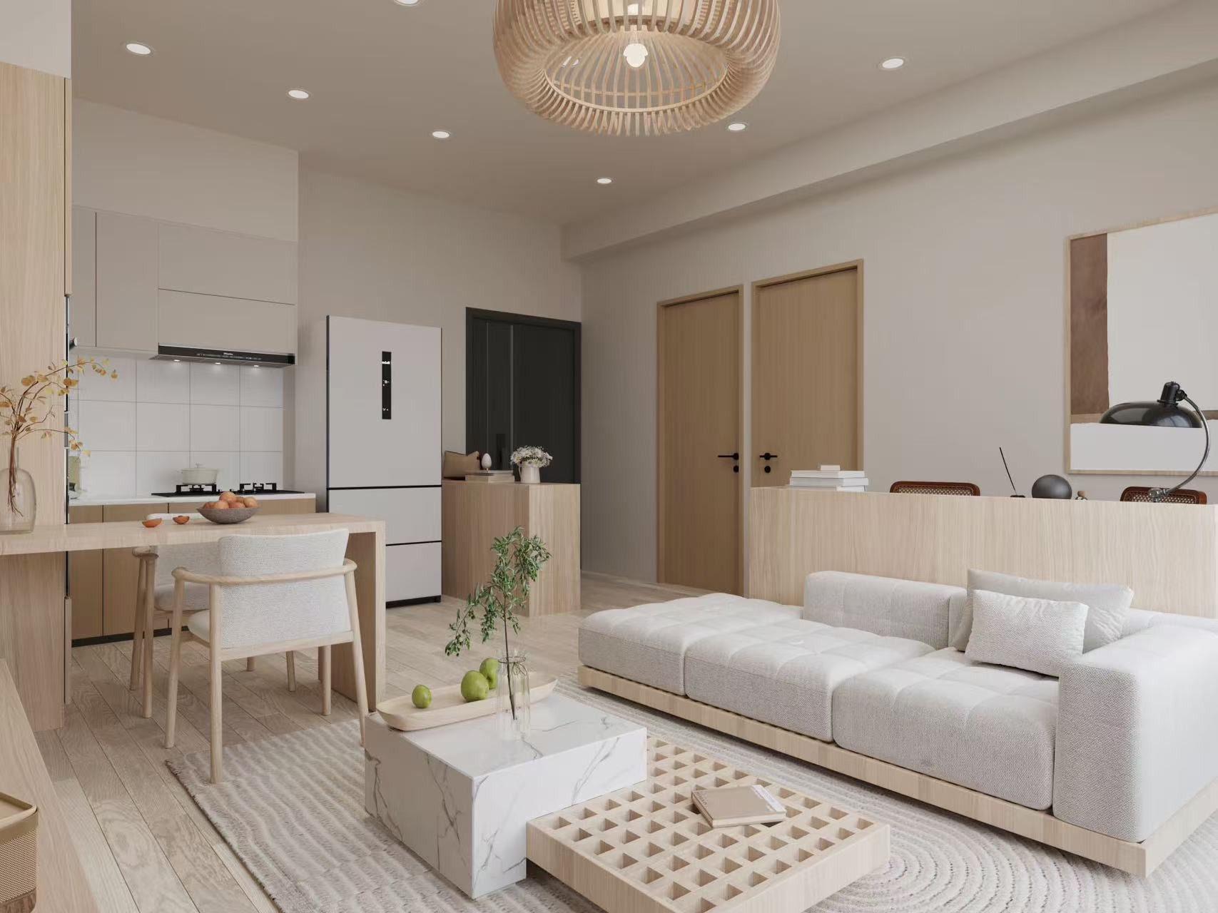 現代簡約與日式無印風完美融合,這套設計以「功能性」與「美學」為核心,營造出溫馨且實用的居家空間。淺色木質搭配柔和的中性色調,讓整體氛圍倍感自然舒適;開放式廚房與客廳無縫銜接,提升空間流動性與互動性。電視牆簡約設計與嵌入式收納完美結合,打造整潔有序的居住環境。大面窗戶引入自然光,與溫暖的木地板相輝映,更顯空間明亮與寬敞。