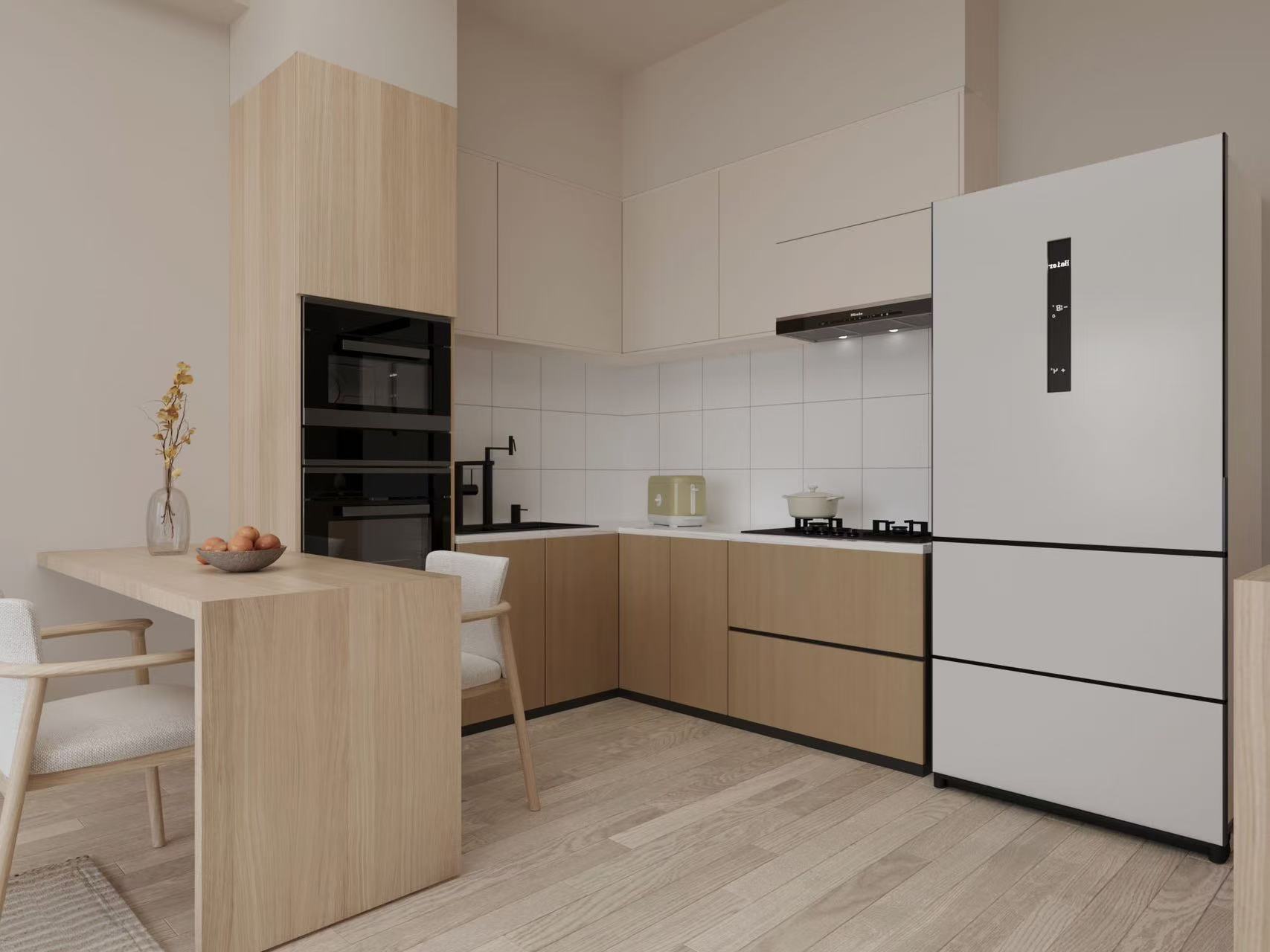 以「現代簡約風格」為核心,搭配「日式無印」的溫暖質感,實現功能與美感的完美結合。L型廚房布局充分利用每一寸空間,簡約的木質櫥櫃與米白色牆面相得益彰,營造出整潔明亮的烹飪環境。嵌入式電器設計提升了整體空間感,讓廚房裝潢更加簡潔實用。