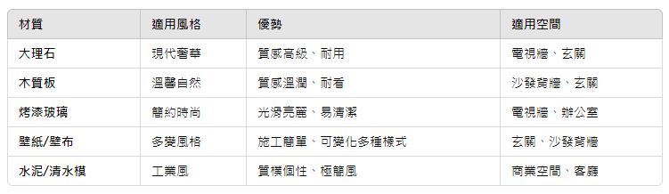 不同的材質能帶來不同的視覺效果與使用體驗,選擇時應根據風格需求、預算與施工難度來評估。