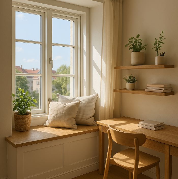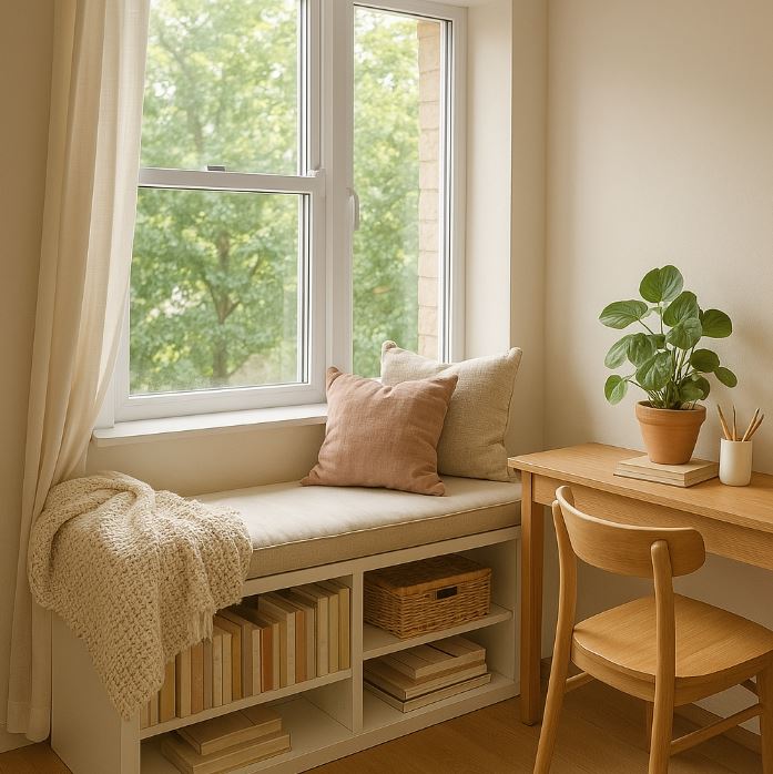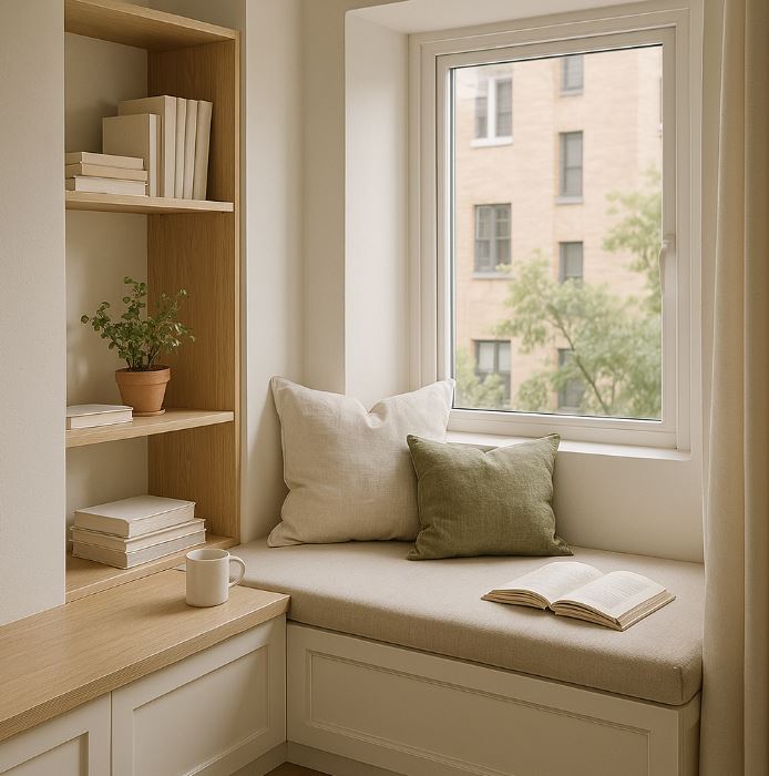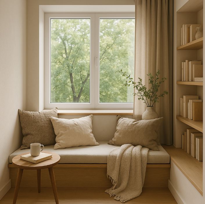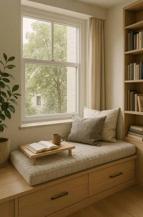 設計建議: 在窗邊設置可調節的座椅,並配上柔軟的靠墊和小書架,讓這個區域既舒適又實用。