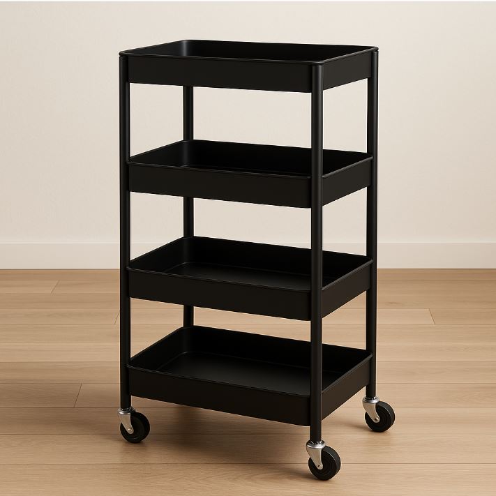 層架式可移動置物架是最普遍且實用的類型,通常為金屬或塑料結構的多層架體,底部附有輪子,方便推動。其層數多為三至五層,設計簡單、可自由搭配多種空間。