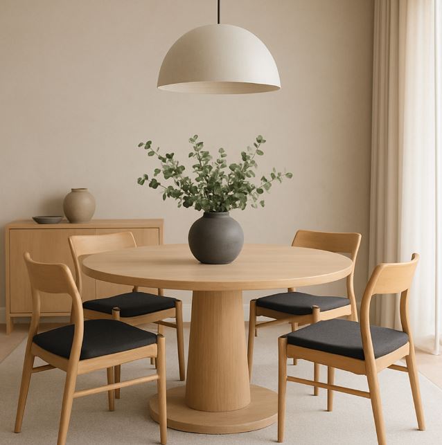 小型空間: 若餐廳空間較小,圓桌是理想選擇,因為它能有效節省空間並避免擁擠感。圓桌的無尖角設計讓空間顯得更開放,適合小家庭或單身公寓。圓桌也能促進用餐時的交流,打造更為親密的聚餐氛圍。