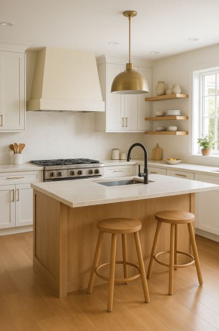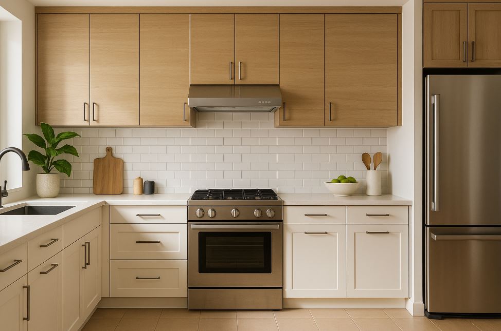 風格混搭設計:現代風格多採用俐落線條與亮面材質,而復古風格則偏好懷舊色系與仿舊木作。兩者可透過跳色門板、復古磚、黃銅把手等細節進行融合,創造具層次的廚房空間。