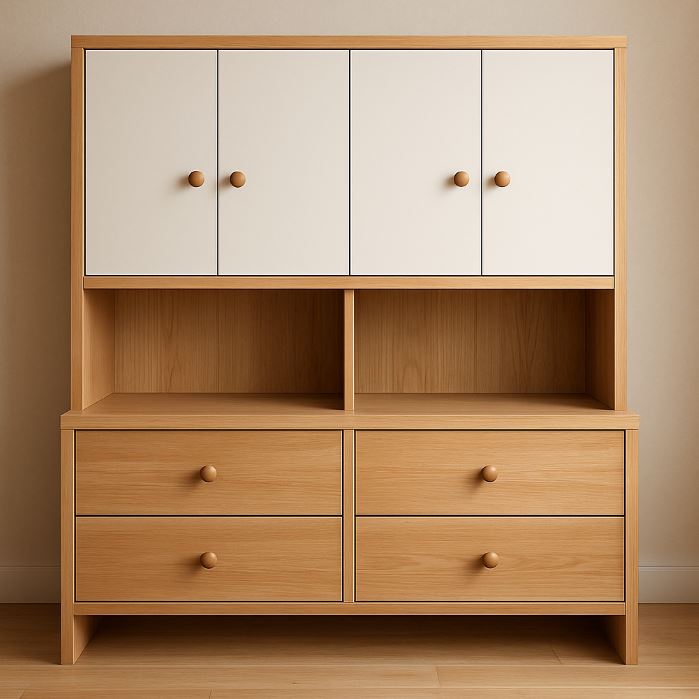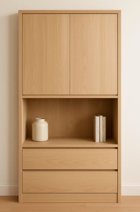 實木櫃體:天然木材如橡木、胡桃木不僅質感溫潤,還具有良好耐久性,非常適合傳統、日式或北歐風格設計。