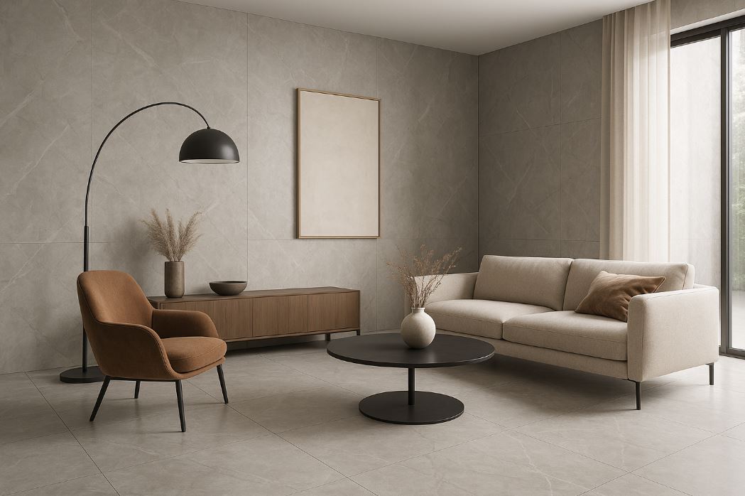 極簡風格首選單色大板磚:選擇霧白、米灰等素色大板磚,搭配俐落線條與極簡家具,打造純粹、安靜的空間氛圍。