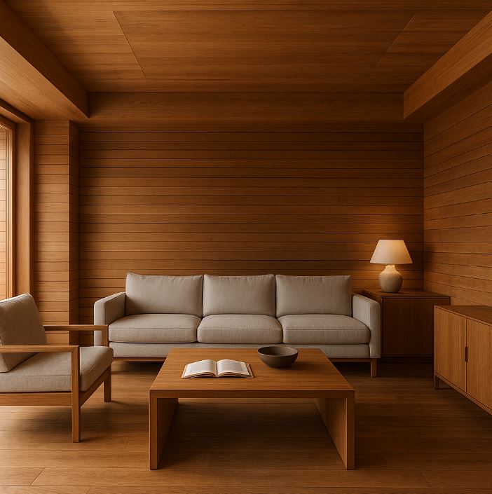實木牆面與天花板:結合燈光設計,可營造出溫潤放鬆的視覺氛圍。