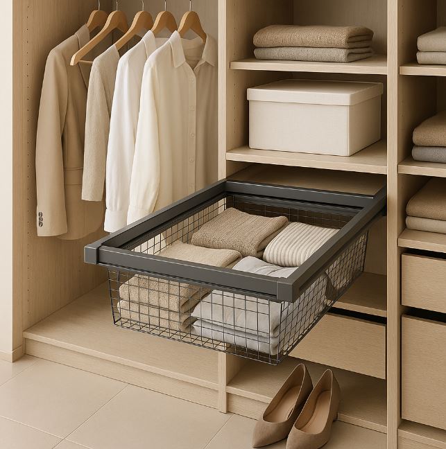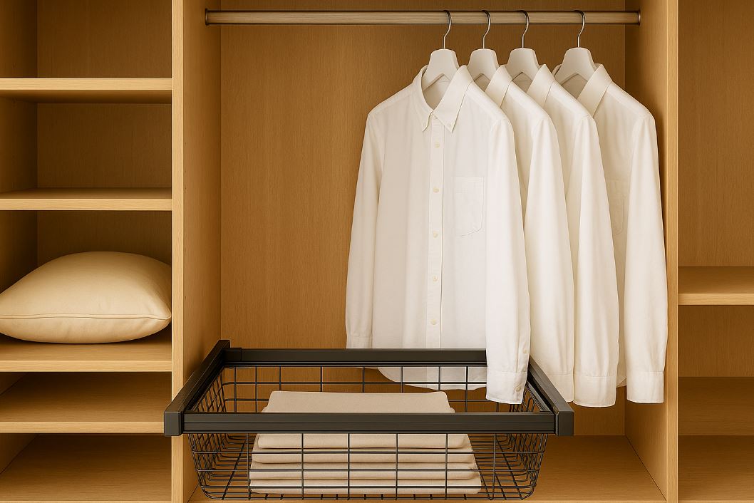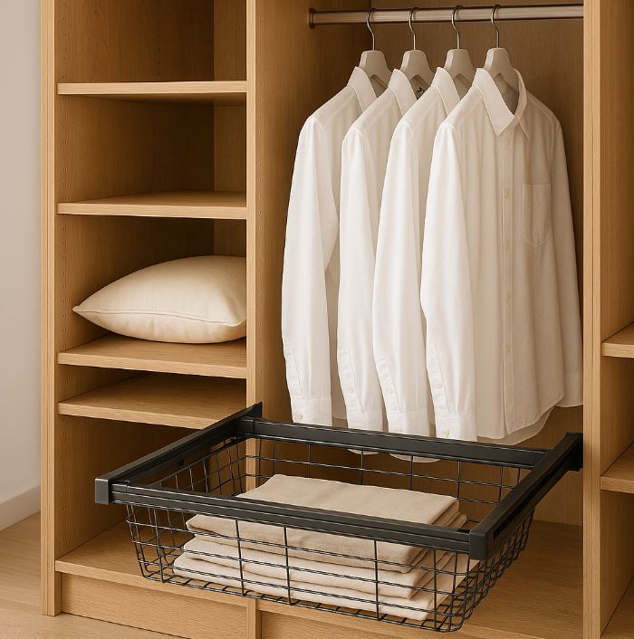 強化衣櫃收納容量:拉籃能有效利用衣櫃垂直空間,將衣物分類存放,小物件、配件也能清楚歸位,大幅提升衣櫃整體容量與使用效率。