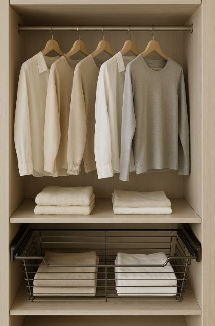 透過精心規劃與合理配置,拉籃不僅能大幅提升衣物分類與存取的便利性,還能讓整體衣櫃呈現更清爽有序的視覺效果。