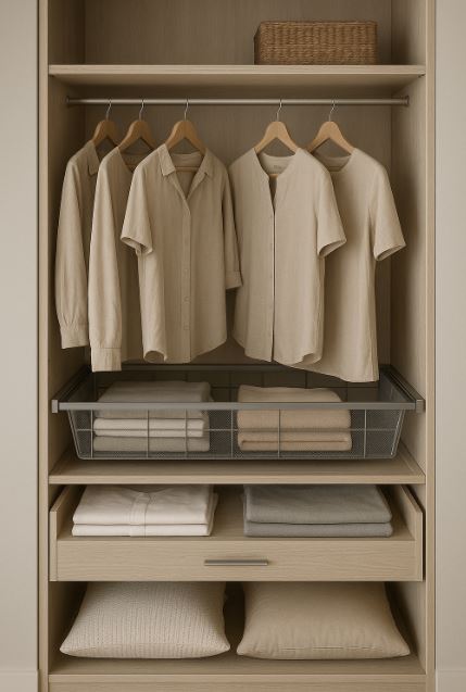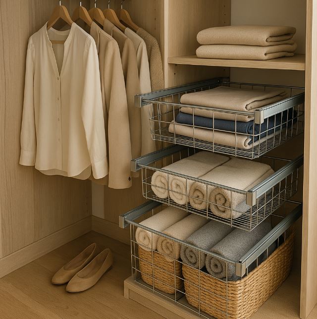 衣櫃拉籃是近年室內設計中非常受歡迎的收納設計之一,不僅提升收納效率,也讓衣物分類更加有條理。