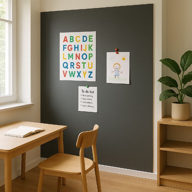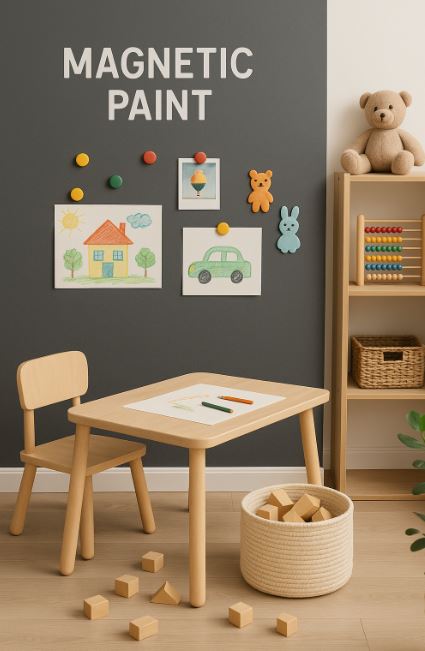 磁性漆應用廣泛,適合兒童房、辦公空間、廚房備忘牆或工作室展示牆。