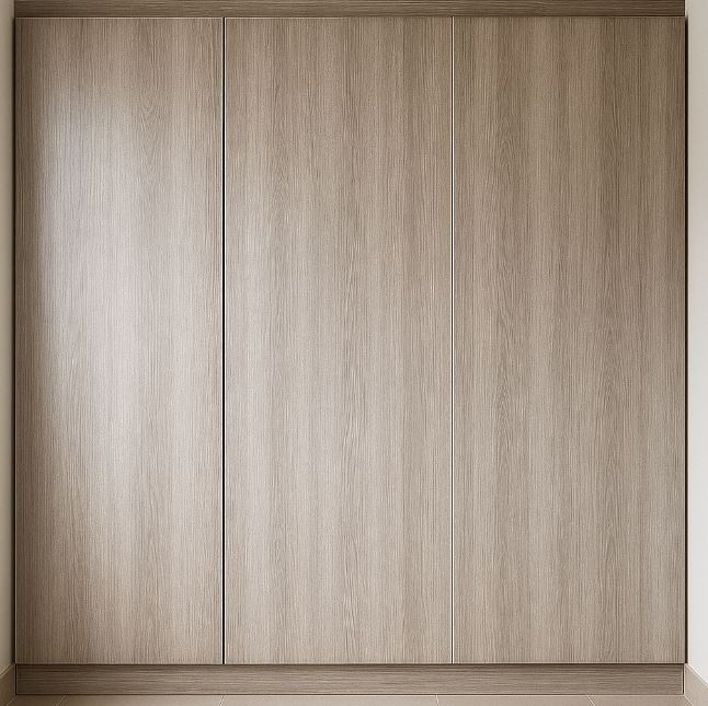 三胺板表面經樹脂高溫壓製,具有出色的耐磨、抗刮、防污能力。常見應用於系統櫃、衣櫥門板、廚房收納櫃等高頻使用空間,特別適合潮濕氣候下需要耐用材質的家庭。