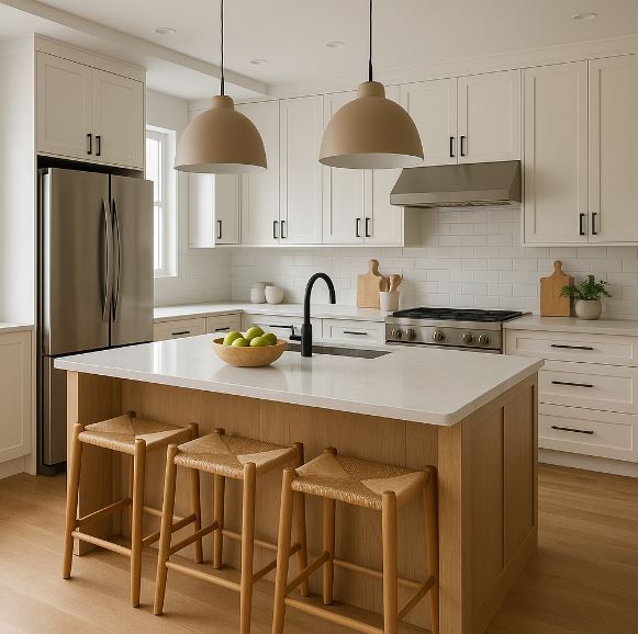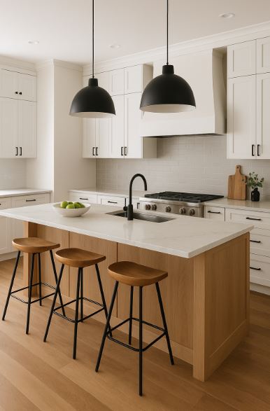 若廚房過於空曠,不妨設置一座中島或延伸型工作吧檯,不僅增加操作台面與收納空間,也能作為用餐或社交交流的場所,提升整體空間感與實用性。