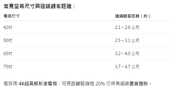 65吋電視 → 適合距離為約 2.5至4.1公尺