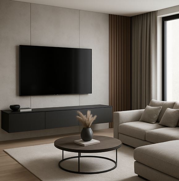 沙發高度通常約為40~45公分,電視安裝時應以坐下時的眼平線為主,並適當調整牆面掛高或櫃體高度。
