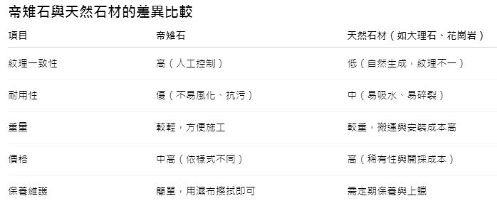若追求質感與天然紋理,天然石材依然是經典首選;但若考量施工便利、耐用與維護成本,帝雉石更具現代實用價值。