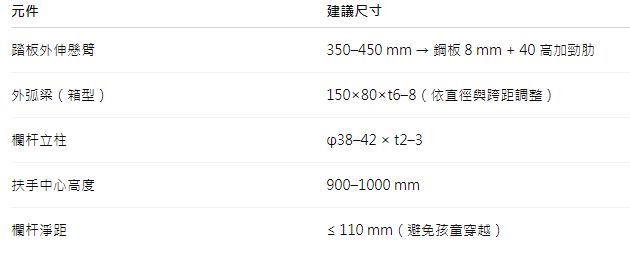 內緣最窄處:≥ 100–120 mm,避免「踩空」風險。