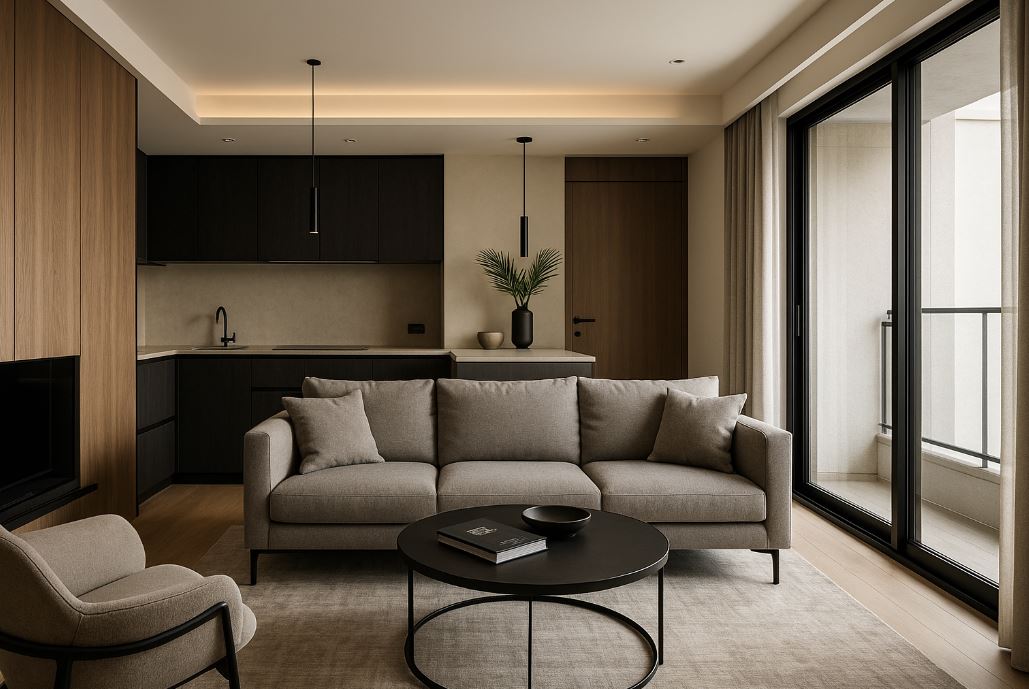 現代奢華:暖灰+胡桃木+霧金金屬。