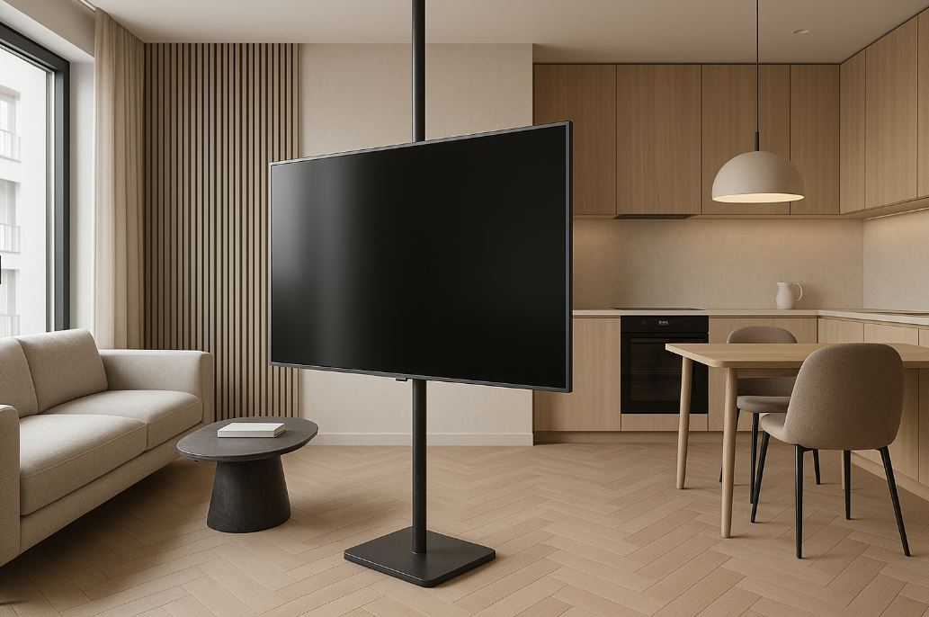 客餐廳一體、廚房邊看邊煮、臥室想躺坐皆可視——旋轉(萬向)電視架的彈性,讓螢幕不再被牆固定。
