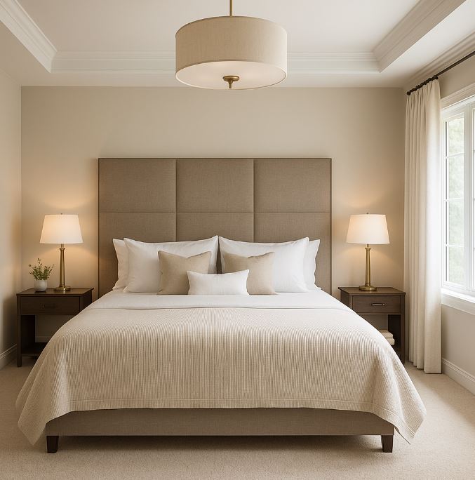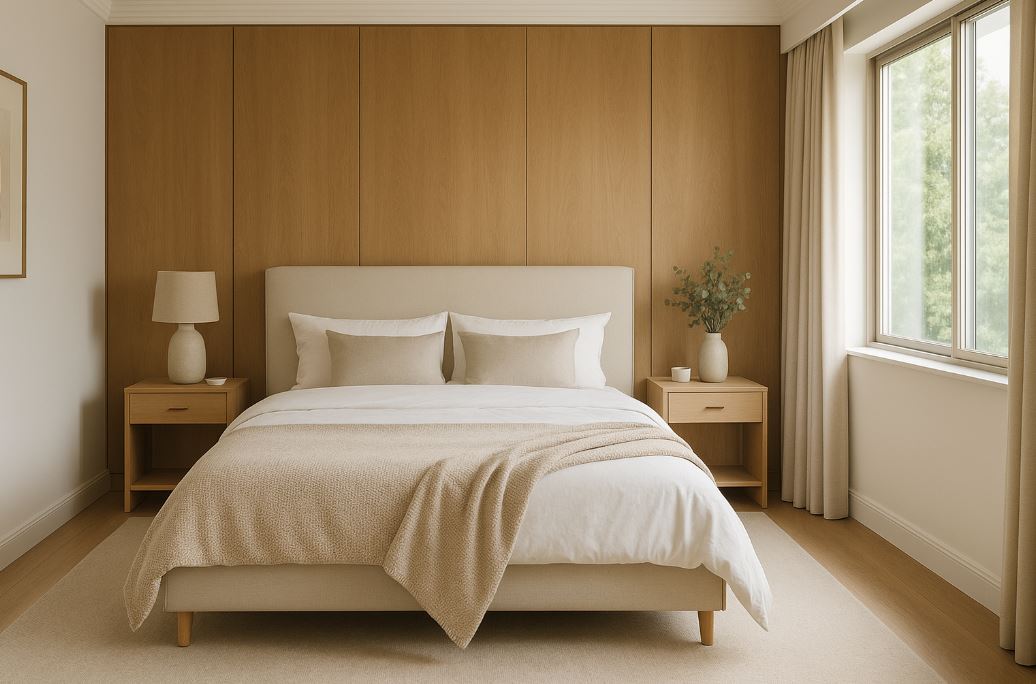 床頭板比例:寬度 ≥ 床寬+100–200 mm,高度 900–1100 mm,既有靠感又不壓迫。
