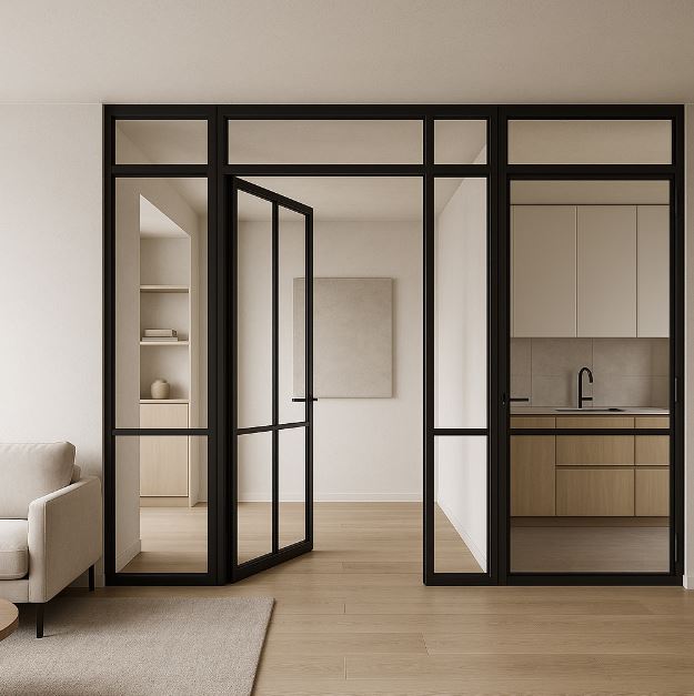 框寬:建議選擇 22–28 mm 窄框門,搭配 清玻或超白玻,確保空間通透。