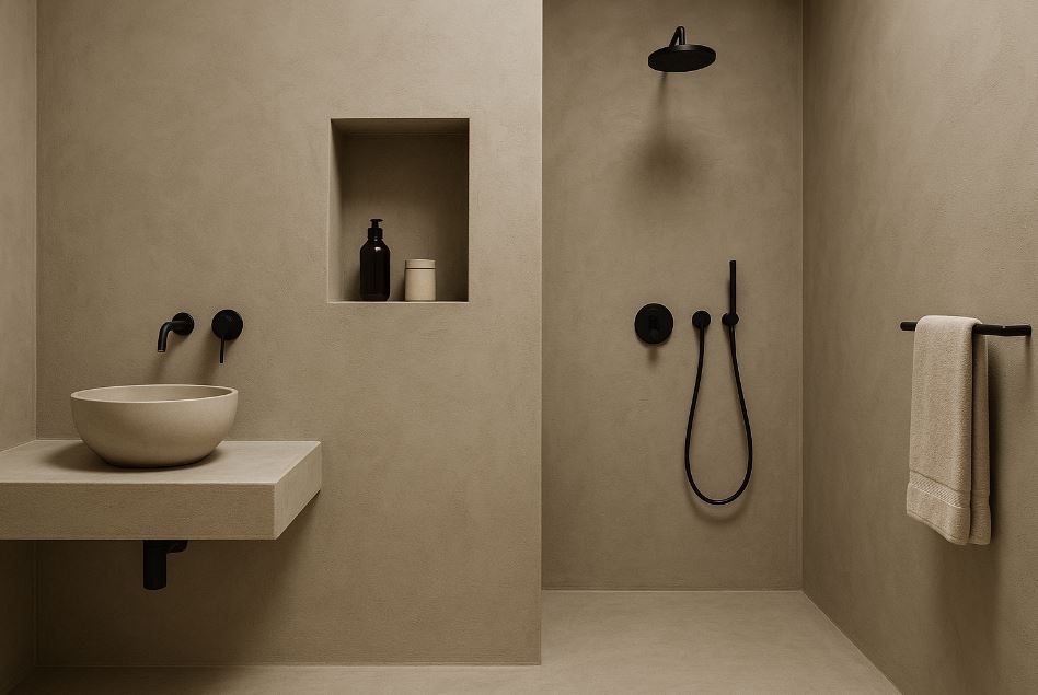 在防水層之上,以薄層抹塗/塗佈形成連續無明顯拼縫的功能飾面,可跨牆、地、檯面與壁龕。