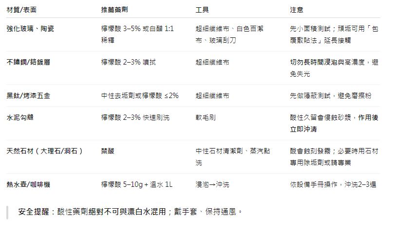 解法是用弱酸溶解+足夠浸潤時間,依材質選對工具,再徹底沖淨、擦乾與防護。