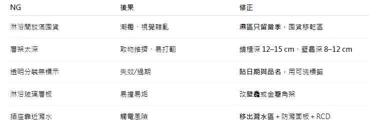 衛浴東西多又潮,若沒有依動線與濕度的收納策略,再多層架也會回到凌亂。
