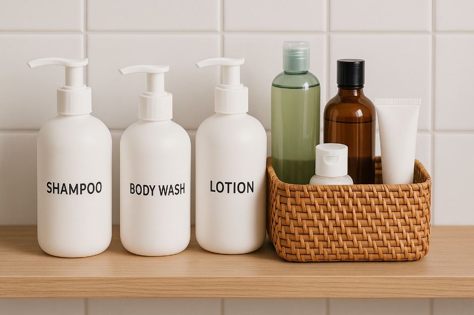 只留當季洗髮、潤髮、沐浴與刮鬍等。其餘移出。