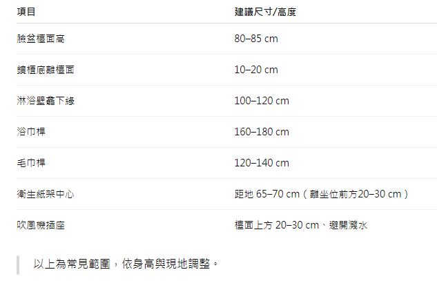 - 深度18–25 cm 避免碰頭;門片或上翻門防灰。置衛生紙、備用備品。